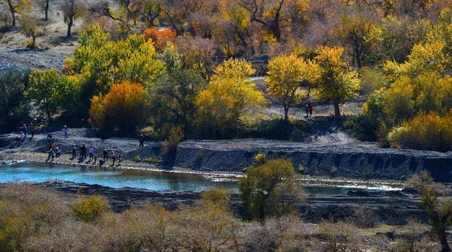 金秋十月,新疆克拉玛依市乌尔禾区白杨河大峡谷景区胡杨林迎来“醉”美时节,从大峡谷之上俯瞰谷底,金色的胡杨、火红的红柳、遍地的梭梭,与千奇百怪的雅丹地貌、弯弯曲曲的河流相互映衬,呈现出迷人的风景,吸引着市民和游客。