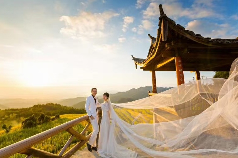 福建日报APP-新福建10月18日讯(记者 吴洪)凤凰梯田、千年古樟、红河谷、大地相框……南平市延平区三楼村新设置的10多个婚纱照打卡点最近火了,国庆期间吸引了上千游客慕名而来,而这些网红打卡点是闽台乡建乡创团队共同打造的。10月17日,首届两岸婚庆文创产业展在三楼村举行,展出大陆团队近期以三楼村为取景地的37张婚纱摄影作品,以及台湾摄影团队在台湾取景的18张高山婚纱摄影照片。
