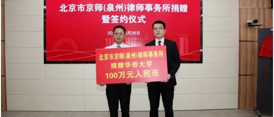 为提升高校理论联系实践能力,践行“产学研”深度融合理念,京师泉州律所向华侨大学法学院定向捐资,共建京师法律产品研究中心。2020年10月26日,北京市京师(泉州)律师事务所与华侨大学法学院“京师法律产品研究基金”捐赠仪式暨“京师法律产品研究中心”揭牌仪式在华侨大学陈嘉庚纪念馆隆重举行!