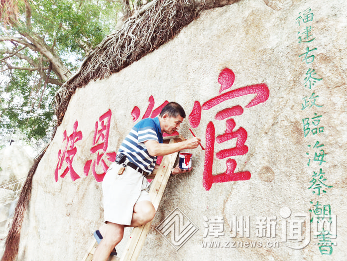 “东山岛九仙山汇集了历代官宦、文人墨客、僧人留下的摩崖石刻20多处,但经多年风吹日晒,颜色脱落,字迹逐渐褪色,难以辨识。为了保护文物古迹,五六位志愿者自发组织起来,对摩崖石刻上色‘美容’。”昨日,年已过花甲的刘长国边埋头描红,边向笔者介绍。