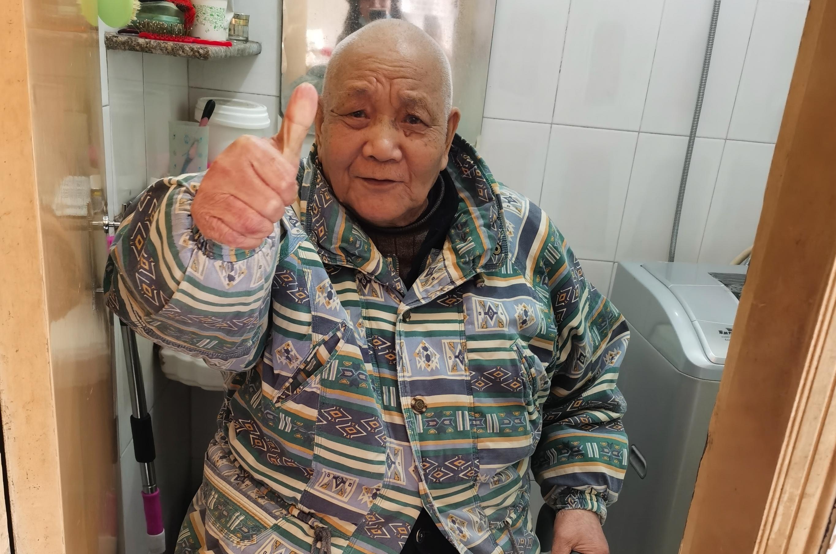 老人坐在助浴椅上,高兴地竖起大拇指点赞。