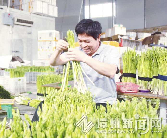 穿梭于青翠葱郁的笋田里,眼看着一行行刚出土的芦笋菱角尖尖、漾青泛绿,饱含生机,吴龙通的眼角都笑弯了。吴龙通是村里的种植能手,有十多年种植芦笋的经验,“最近芦笋长得很快,今天才露一个头,明天就有一根筷子那么长了,笋头与拇指头一般粗,基本上每隔一天就得割一次。”他说,芦笋除了7月和2月为休养期,其余月份均为采摘期,近几个月是采摘旺季,每天平均可采摘新鲜芦笋150斤。
