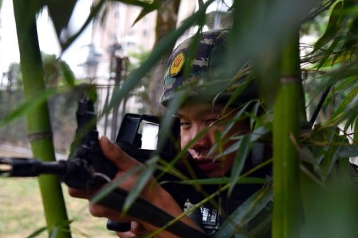 图为官兵利用遮挡物隐蔽。 刘欢 摄