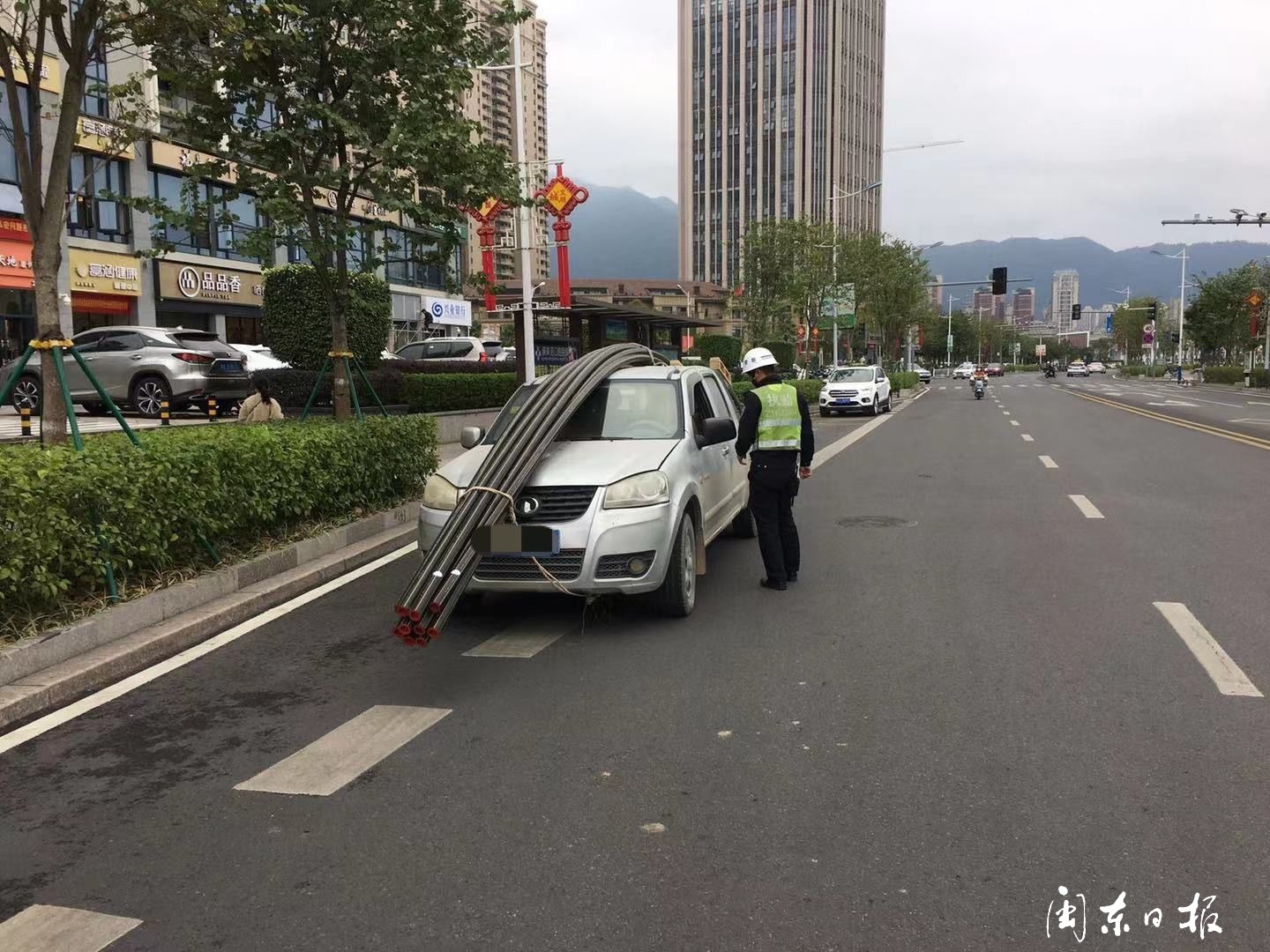 12月8日,市公安局交警支队直属二大队大门山中队警员巡逻至南湖滨路时,发现一辆灰色的轻型栏板货车超长的嫌疑,执勤人员立即示意该车驾驶员停车接受检查。该货车装载的管道超过车身长度近2倍,车辆右前方挡风玻璃完全被管道遮挡住,管道的尾部还拖在地面上,且只用了两根绳子简单固定住,所载管道这样的车辆在路上行驶,对前后方的车辆带来巨大的安全隐患。