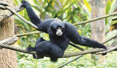 长臂猿有时会因为嬉戏太开心,在树枝上摆荡时荡出墙外。