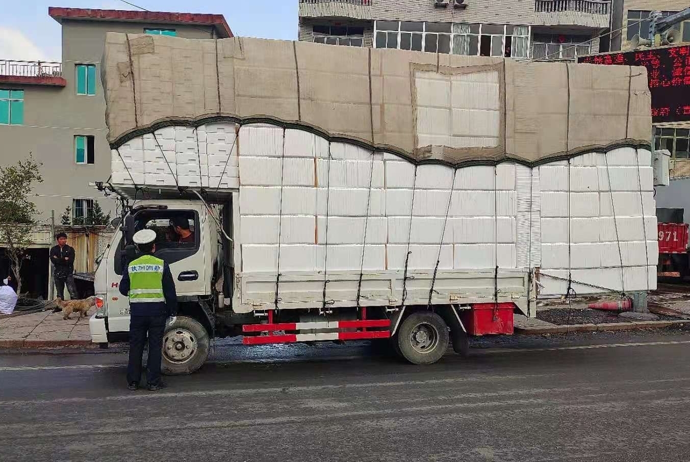 “这满车泡沫板严重超出了货车的高度和长度了。”民警告知两名货车司机,货车装载货物不能超过车箱尾部,其运输的货物明显超长,违反了道路交通安全法相关规定。违法司机对自己的违法行为表示惭愧,承认知道自己属于违法运输,为多赚几个钱才铤而走险,并表示一定吸取教训下不为例。