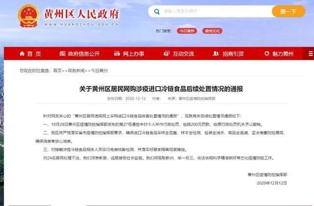 12月12日,湖北黄州回应“居民违规网购进口冷链食品被罚”:对24名居民处理不当,深表歉意。对个人所作行政处罚,包括200元罚款,予以撤销。