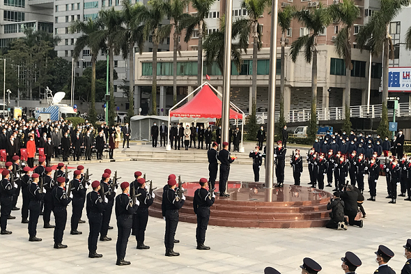 上午8时整,澳门纪律部队仪仗队迈着整齐的步伐,护送中华人民共和国国旗和澳门特区区旗,来到金莲花广场的旗杆下。