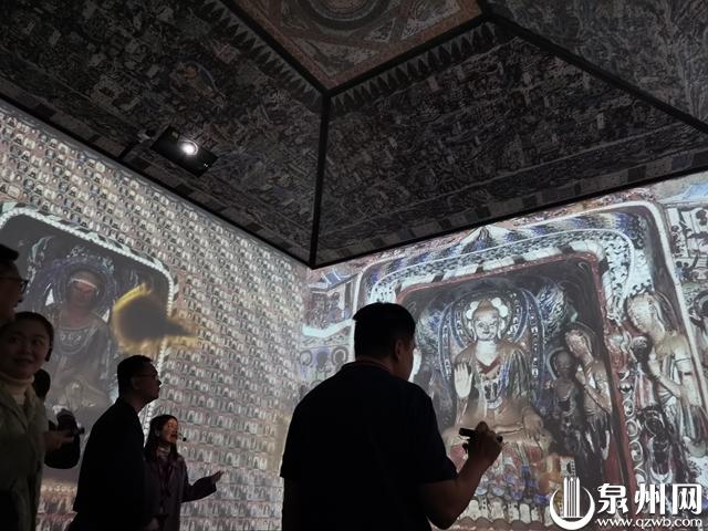 这五城采用实体场景与数字多媒体技术相结合的方式呈现,以沙州为例,实体场景仿照敦煌莫高窟搭建“暗室”,在顶部和墙壁上投射出裸眼3D特效的壁画等数字影像内容,人们拿着展厅提供的特制手电筒,可以照亮壁画、探索未知区域,并通过感应功能与数字影像进行现场互动。