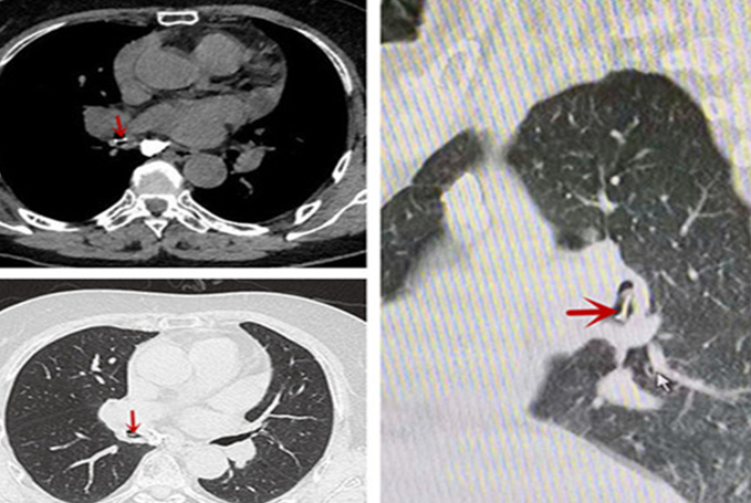 该院呼吸内科主任医师邓新宇接诊后,看了患者的肺部CT片子:“您可能是气管里有异物,建议先做一个气管镜检查”。