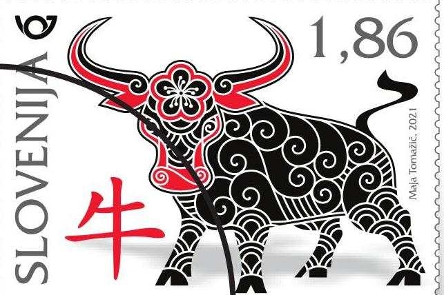 日前,斯洛文尼亚邮政部门公布了2021年“牛年”生肖邮票的图稿,邮票主图为一头牛和中文“牛”字,线条流畅,设计简洁大方。