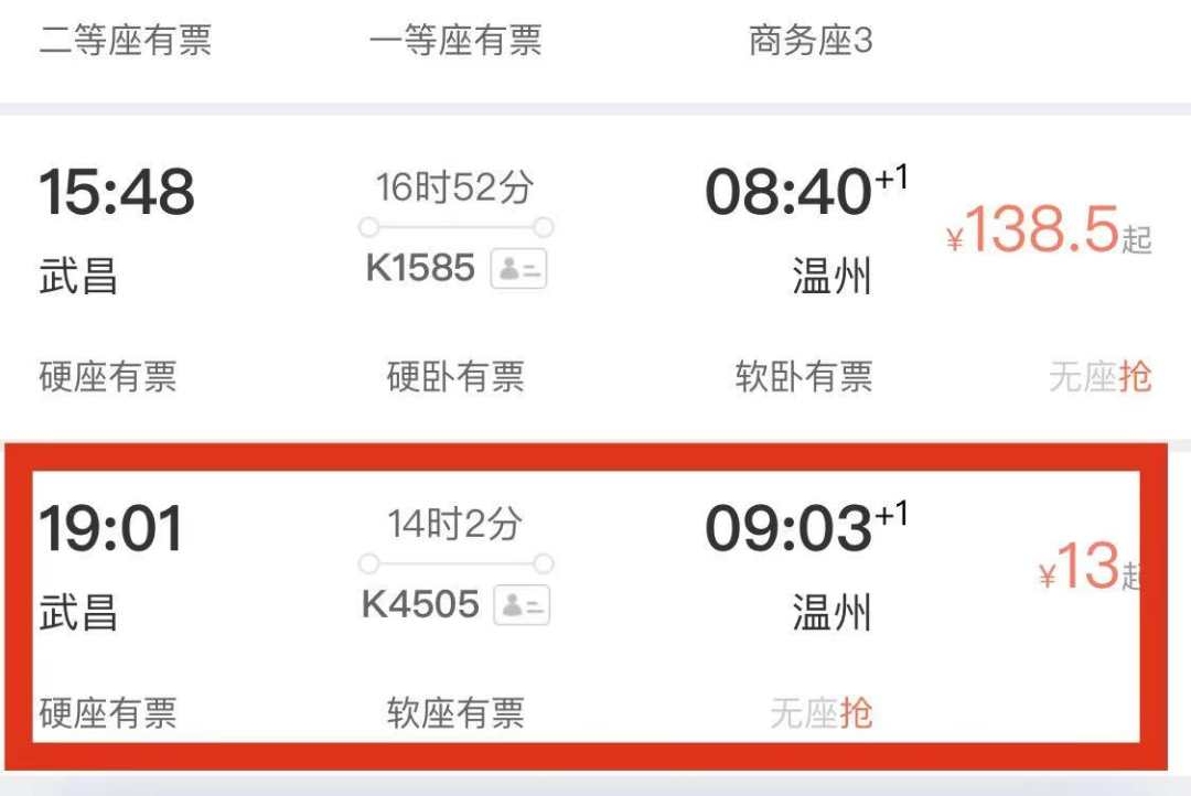 今年的春运将在1月28日开始,1月30日,武昌开往温州的K4505次列车开行,目前可以买到1月30日至2月6日的车票。从12306网站上可看到,这段全程行驶里程为934公里的路段,硬座票价仅为13元。
