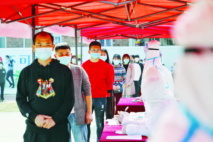 在工作人员指引下,待采样人员在等候区域按照1米社交距离要求排队等候。