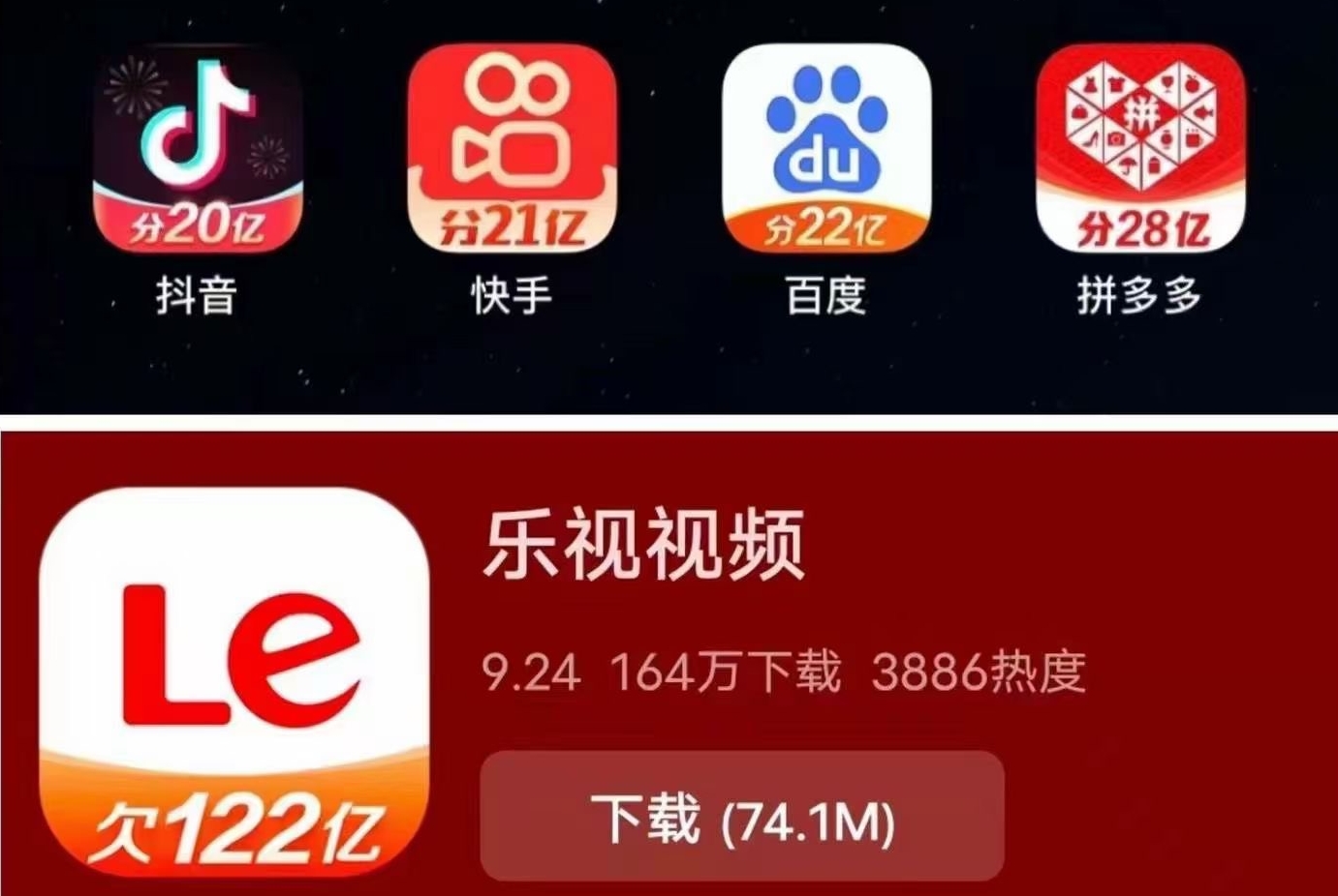 2月6日晚间,多家媒体报道,在安卓手机的App商城搜索发现,乐视视频App写着“欠122亿”。春节临近,各大App纷纷推出红包活动,并将红包金额更换到了App图标上,如抖音分20亿,快手分21亿,百度App分22亿,拼多多分28亿。