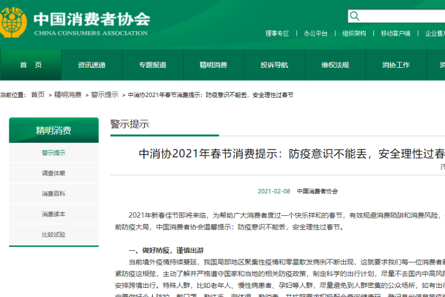 2021年新春佳节即将来临,为帮助广大消费者度过一个快乐祥和的春节,有效规避消费陷阱和消费风险,并维护好当前防疫大局,中国消费者协会温馨提示:防疫意识不能丢,安全理性过春节。