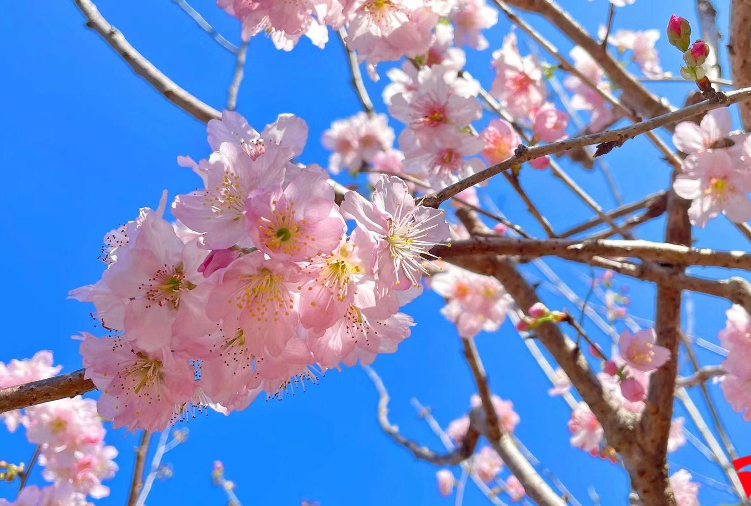 漫山遍野的樱花绵延在山头,在阳光的照耀下,一簇簇娇艳欲滴的花朵显得格外鲜艳。