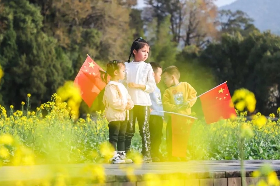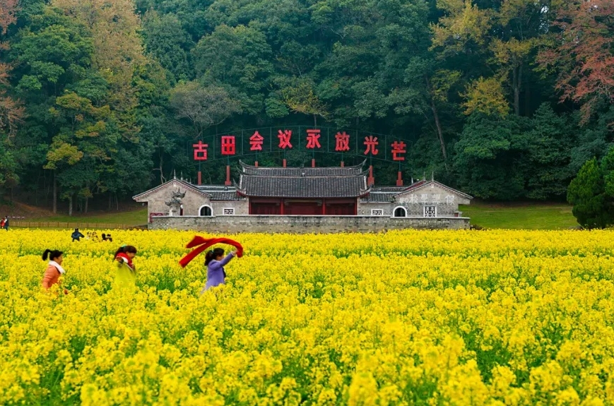 近日,位于福建省龙岩市上杭县的古田会议会址旁,油菜花海绽放,美不胜收。