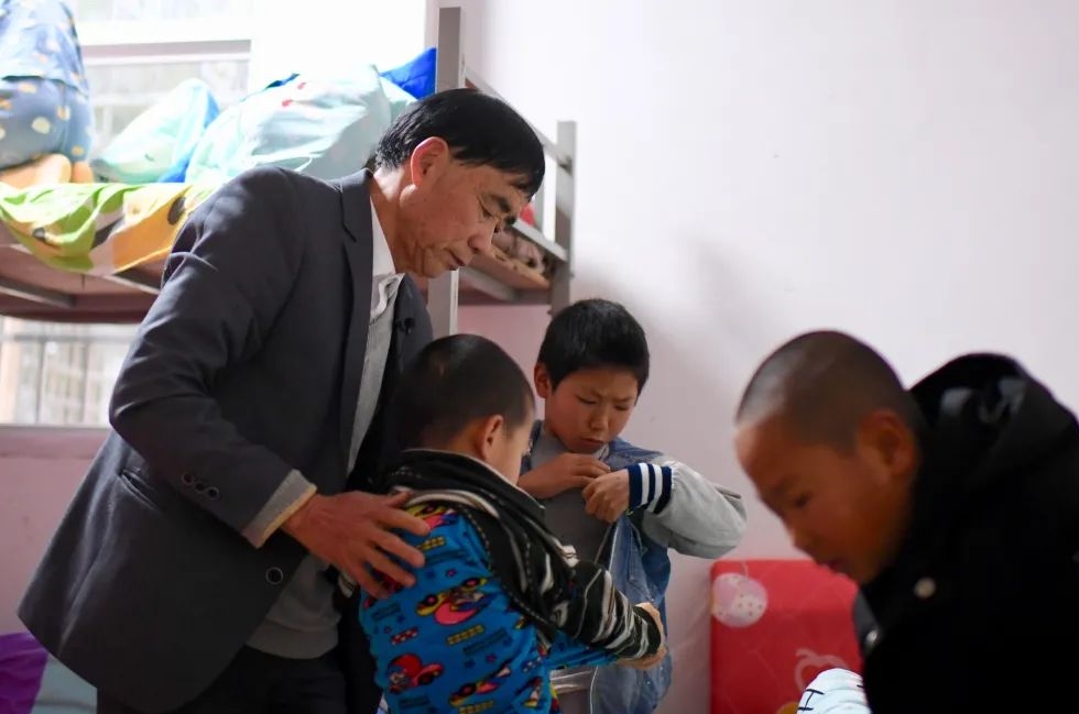 ↑3月1日清晨,庄桂淦帮着低年级的学生穿衣。新华社/图