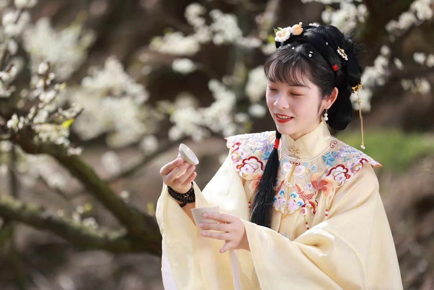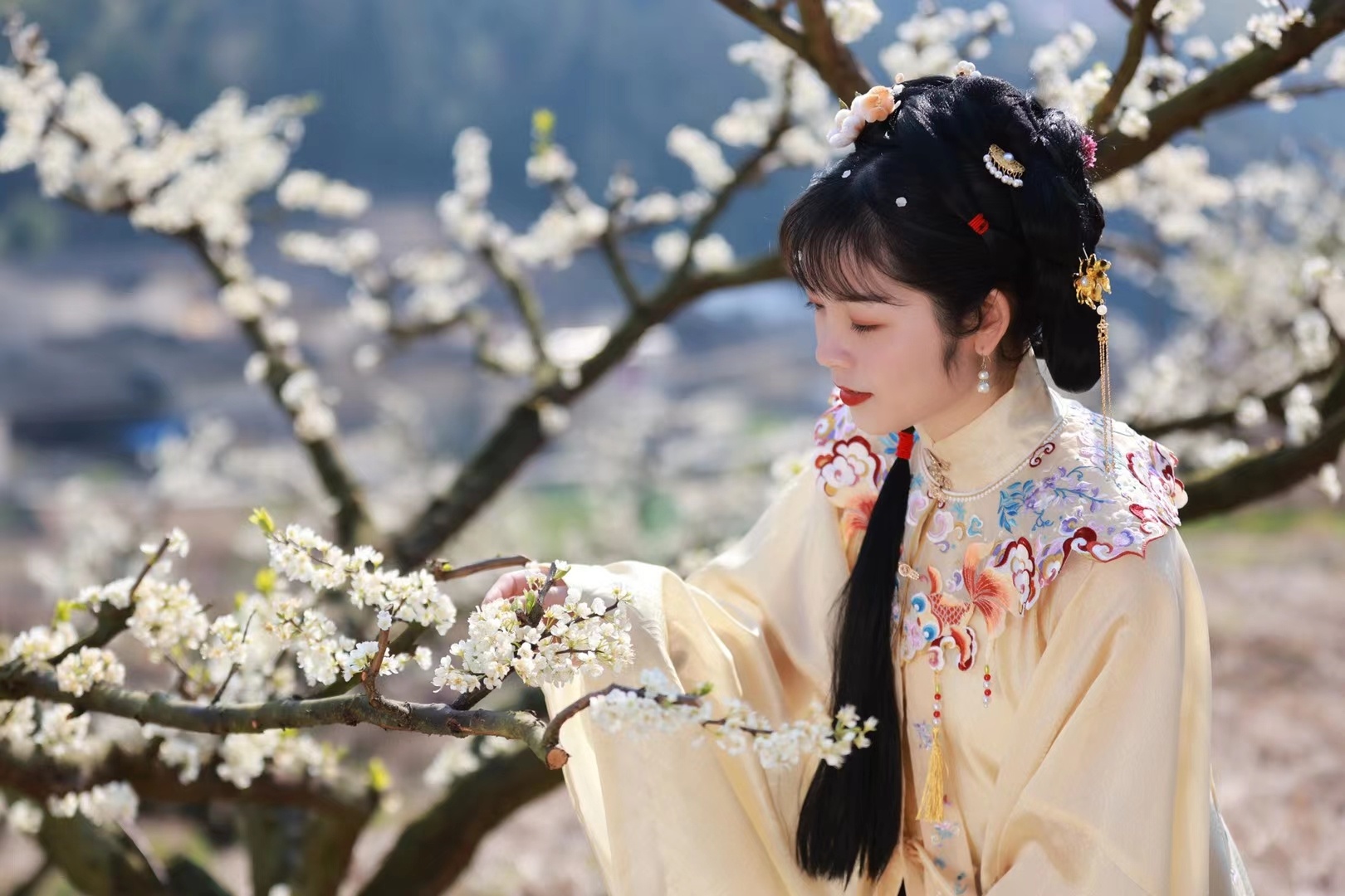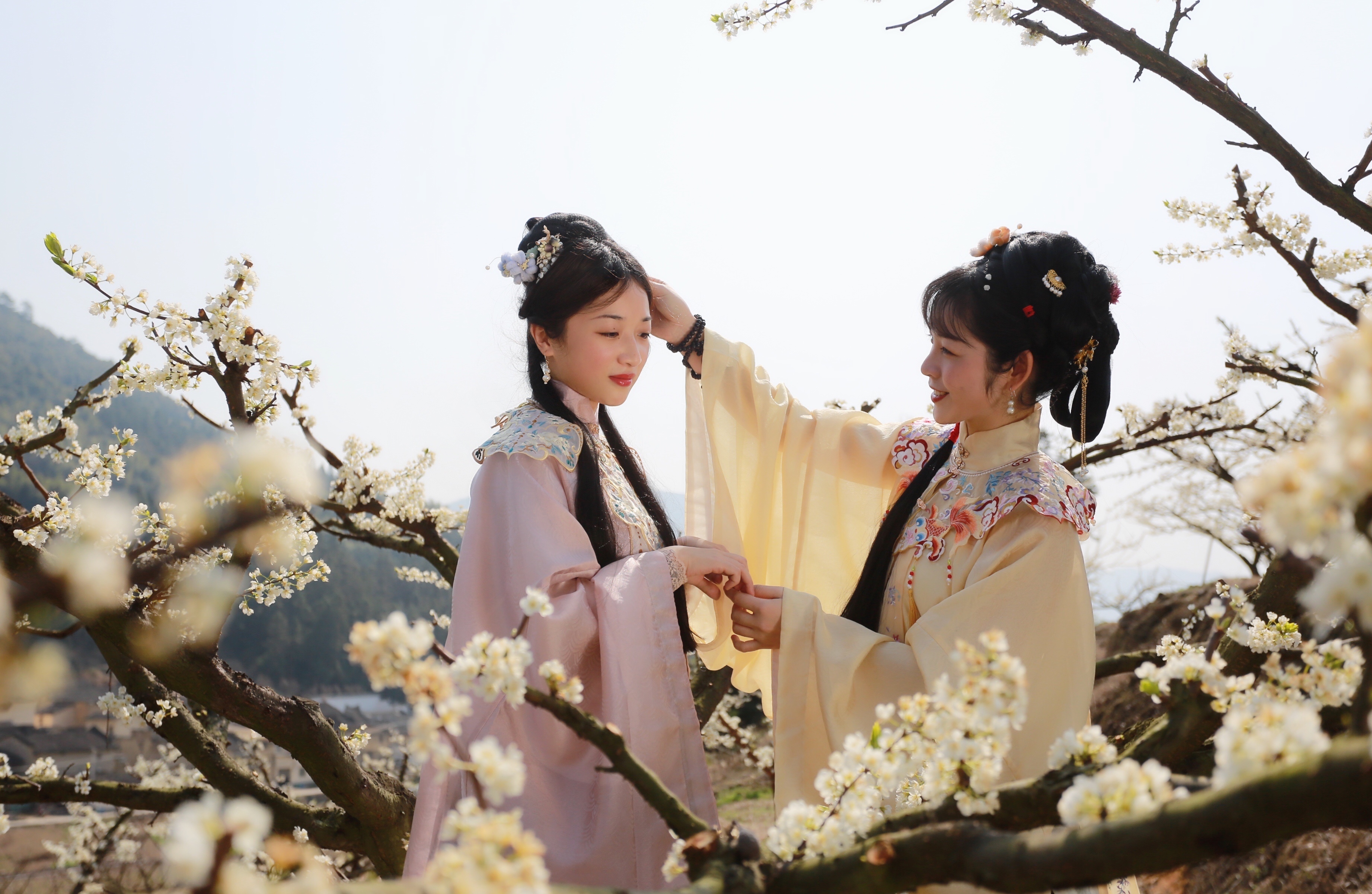 初春时节,福建省宁德市古田县长岭村芙蓉李花开正旺。几位身着汉服的妙龄女子在芙蓉李花林中赏花留影,赴一场春日盛宴。她们或漫步花林衣袂蹁跹,或低头赏花温婉自然,为春色平添几抹盎然。