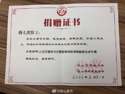 近日,钱七虎向昆山市慈善总会捐赠十万元