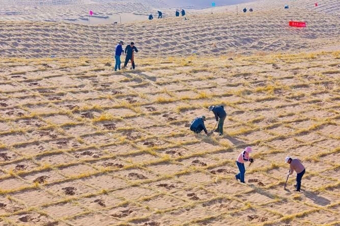 3月12日植树节,甘肃张掖临泽县春季义务治沙植树活动展开,市民们来到临泽县平川镇北部沙区和三北防护林工程区压沙障、栽梭梭,开始新一轮工程治沙。(王将/人民视觉)