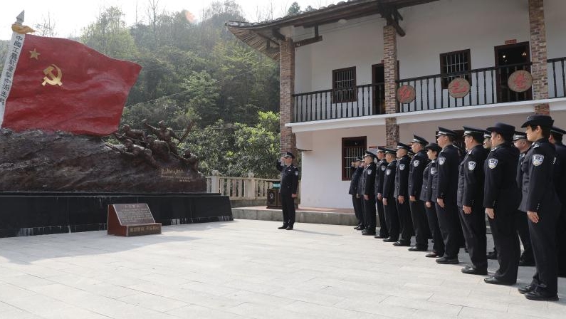 在闽中游击区革命纪念馆前,参加活动的党员民警,列队齐整,面对鲜红的党旗,庄严地举起右手,重温入党誓词,一句句誓词铿锵有力,久久回荡在纪念馆上空。