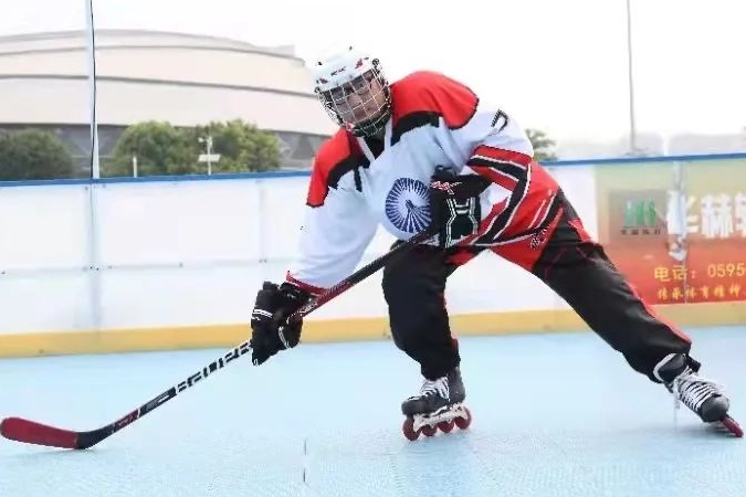 在校轮滑冰球队刚成立之初,他便主动请缨加入其中。这对于他来说既是对轮滑运动的热爱坚持,也是一种勇敢的尝试创新。相对于轮滑来说,轮滑冰球运动对体能耐力、爆发力、团队配合等的要求更高,所需学习掌握的技术更多,所要接受的训练强度也更大。