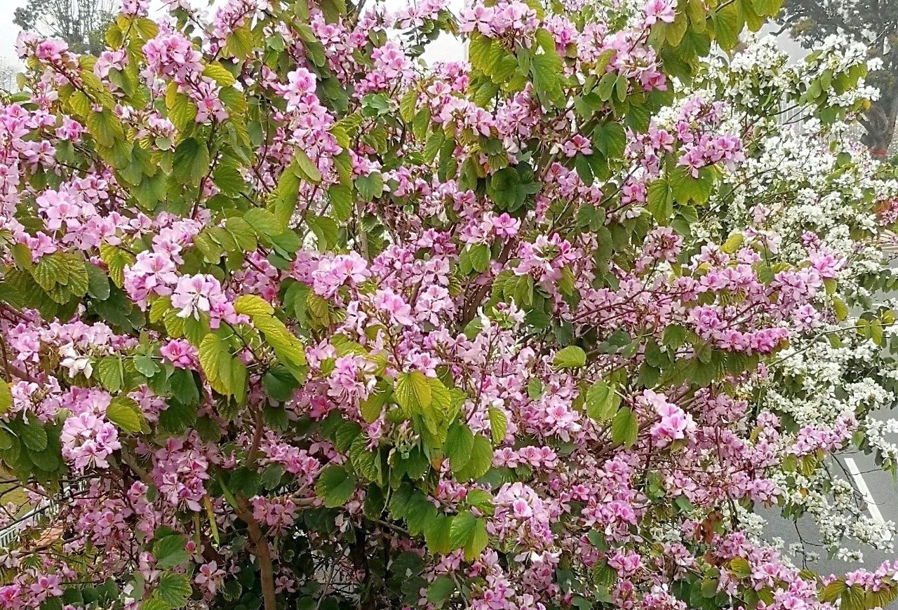 绿意葱葱的枝叶中,或粉或白的花朵争相绽放,格外惹眼。凑近一看,洋紫荆花朵虽然不大,但数量繁多,这些小而艳丽的花朵,密密层层爬满了整棵树的每个枝条与周边的花朵争奇斗艳,交相辉映,奏响了春天百花齐放的乐章。