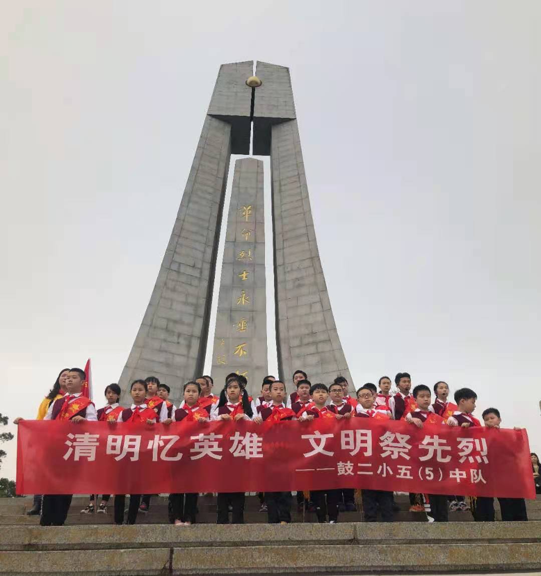 “鼓二小五(5)中队永远牢记:人民为先,祖国至上;强健体魄,健康成长;……振兴中华,再造辉煌!”铿锵有力的宣誓后,全体人员垂首默哀,并井然有序地献上一束束寄托哀思的鲜花。在嘹亮的《中国少年先锋队队歌》中,全体学生向烈士们敬礼,缅怀英雄,寄托哀思。