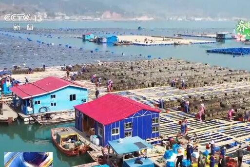 现在我们看到的是福建省宁德市霞浦县的溪南镇。三月春暖,正是海参出笼收获的季节,在海参养殖渔排上,一派忙碌景象。养殖户们把当天要收成的海参笼,从海里拉到渔排上整齐排列,再把海参一个个取出装桶,接着清洗、称重、装箱。