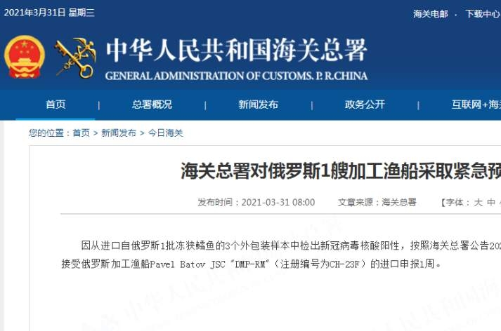 据海关总署网站31日消息,因从进口自俄罗斯1批冻狭鳕鱼的3个外包装样本中检出新冠病毒核酸阳性,按照海关总署公告2020年第103号的规定,全国海关自即日起暂停接受俄罗斯加工渔船Pavel Batov JSC "DMP-RM"(注册编号为CH-23F)的进口申报1周。