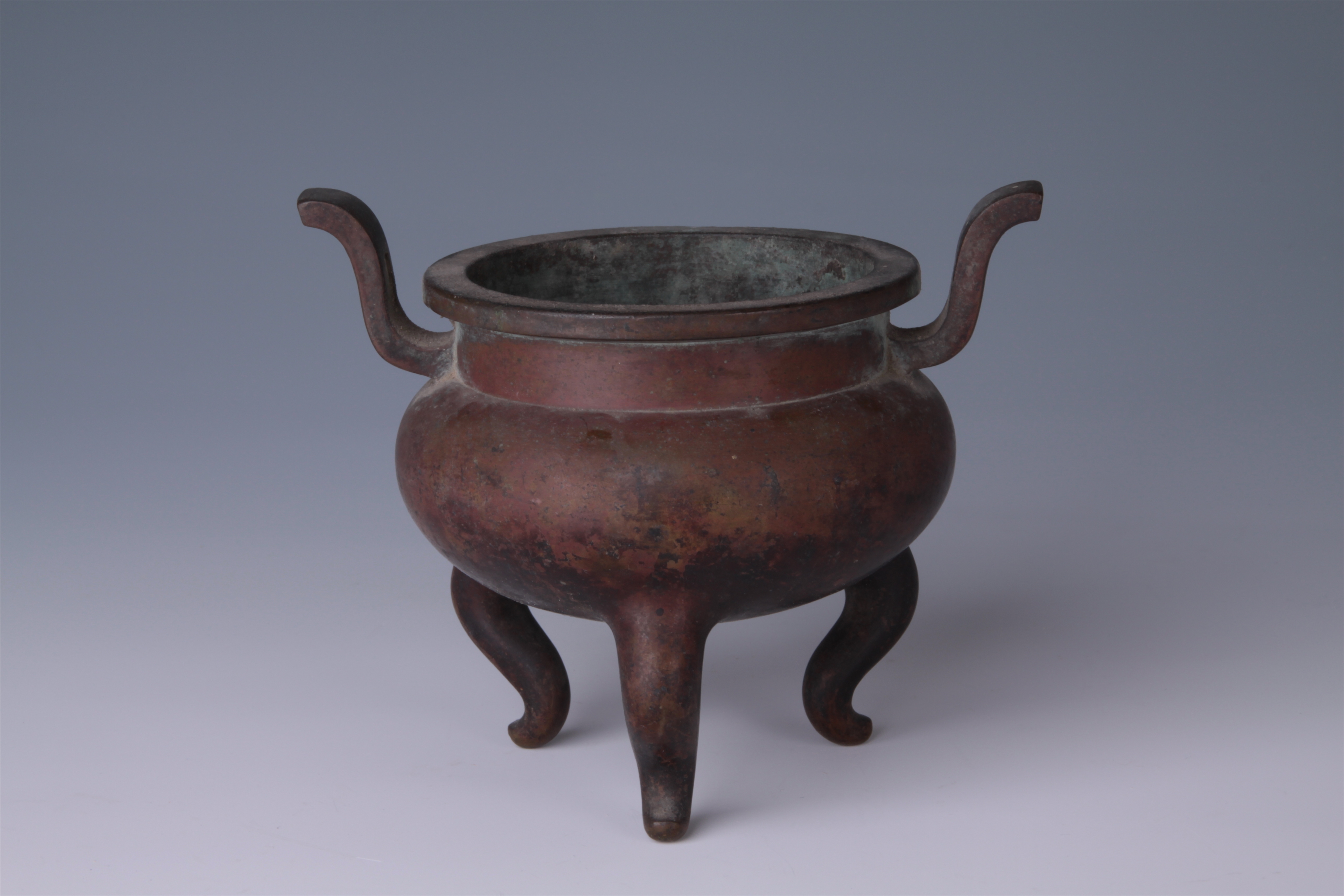 该炉外观简单,仅颈部双耳做法有些夸张,超过口沿较多,与下部三足构成上下平衡。器物表面为素面,无任何刻意装饰因素,整体上表现为简单、朴实、稳重,应是清代早期宣德炉仿品中的佳作。