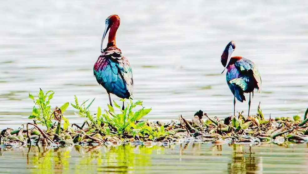 陈向勇是霞浦当地爱鸟专业人士,4月10日上午,他和往常一样在霞浦福宁湾拍鸟时,两只在阳光下,身上闪耀着蓝紫色金属光泽、弯喙长颈的鸟,闯入他的镜头并被迅速拍下。彩鹮?为进一步证实自己的想法,陈向勇当即把照片发给省内相关鸟类专家辩认,都被确定为彩鹮。