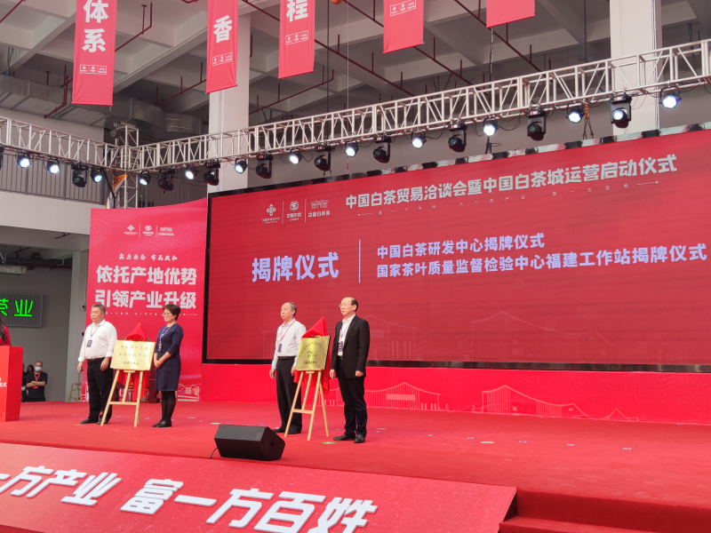 工作站正式揭牌后,活动现场还举行了中华合作时报《茶周刊》“茶叶信息采集点”的授牌仪式、供应链金融启动仪式暨茶叶仓单质押首单签约仪式、中国白茶城纪念茶签字仪式、中国白茶城开业纪念邮票发行仪式以及第一批年份茶(封闭期五年)的入仓仪式。这些仪式的圆满完成,标志着中国白茶城这个总投资8亿元、总建筑面积约18万平方米的项目,全面开启了“一体、两翼、一核心”的创新运营模式。