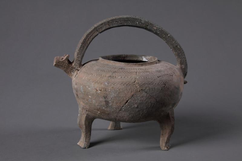 西汉闽越国(公元前202年-公元前110年)陶盉腹围70.5厘米,口径11.7厘米,底径13厘米,通高25.7厘米,厚0.9厘米,足高5.6厘米,泥质灰硬陶,夹部分粗砂粒。三足龙首罐形盉,该器提梁做龙身状拱起,饰有锥点纹,指甲纹,圆圈纹,提梁与龙首形流连接,龙角、眼睛栩栩如生,并饰有指甲纹。器身呈罐形直口,宽肩,鼓腹,平底,肩腹部交错饰六组弦纹,四组指甲纹,三组锥点纹,三兽足等距离分布。