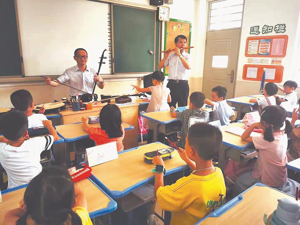 “小小鱼儿好似莲,上江游到下江来哟……”6日下午,一曲散发浓郁田园气息的《采莲歌》,从泉州市泉港区前黄镇坝头中心小学飘扬而出。闻声走近该校的北管培训教室,一群孩子正围坐在北管省级非遗代表性传承人庄炳文身旁,他们一边弹拨手中的乐器,一边聚精会神学唱北管经典曲目。