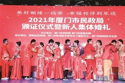 “我们自愿结为夫妻,从今天开始,将共同肩负起婚姻赋予我们的责任和义务……”昨日,厦门市民政局举办了颁证仪式暨新人集体婚礼,14对新人在现场进行庄严宣誓,随后还进行新人跨火炉、跨马鞍、走米袋、拜堂、揭红盖头、喝交杯酒等环节,仪式感满满,尽显闽南婚俗特色。