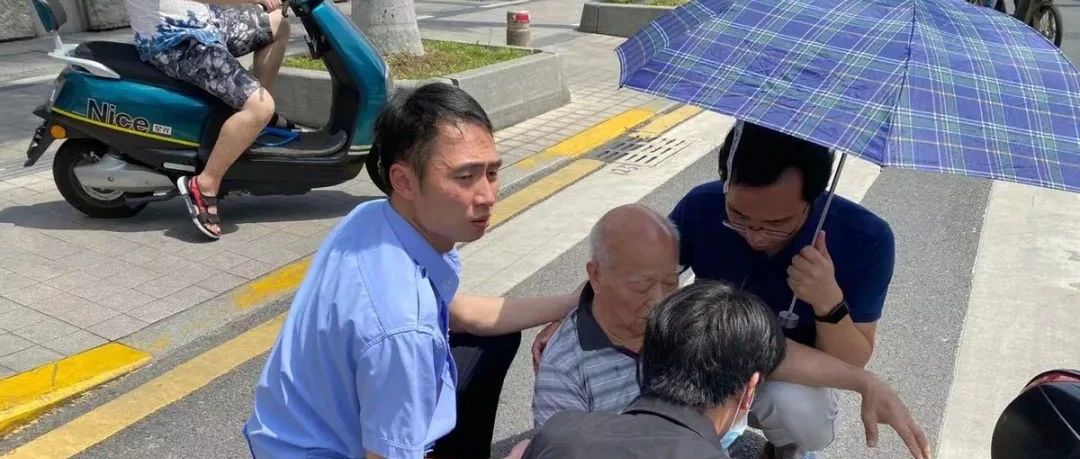 “我是中医,你们快来帮我把老人扶起来!”一名男子从人群中冲出并喊道。“我给老人撑伞,可别中暑了!”另一名男子也上前帮忙。
