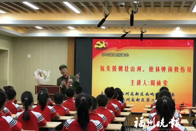 近日,福州高新区第二中心小学和南屿镇关工委联合举办“抗美援朝壮山河,枪林弹雨救伤员”党史学习教育专题讲座,并邀请抗美援朝志愿军老战士周祯荣分享自己的故事。