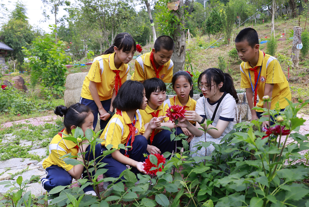 “大丽花,别名大理花,大丽花花色花形繁多,丰富多彩,是世界名花之一,能活血散瘀,有一定的药用价值。”林良熹老师在“百草园”向四(1)班的学生解说到。为抓好学生传承教育,大干中心小学还购买了《中医药与健康》教学参考书等资料,将中草药文化列入综合实践、校本课程教学内容,每周安排一个班级学生到中草药科普教育实践活动基地进行学习实践,传承中草药文化精华。