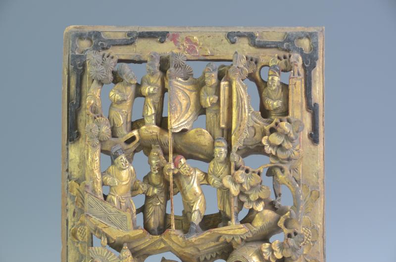 人物故事绦环板长39厘米,宽24.7厘米。长方形,南方杂木,金漆木雕。采用镂空雕刻艺术手法,板面雕刻三层共11位各历史时期的人物故事。四角饰如意纹,四边饰花卉纹。工艺细致,造型生动,为雕刻艺术之珍品。