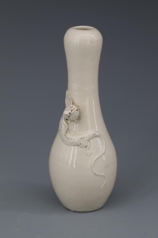 漳窑堆贴螭龙纹蒜头瓶口径3.7厘米、底径3.4厘米、高15.4厘米。蒜头形小敛球口,圆唇,长颈,溜肩,鼓腹弧收,卧足底。颈肩部堆贴一螭龙,龙头雄起于下颈部,合嘴、翘鼻、瞪眼、竖耳、翘鬃,威风尽显;龙身宽壮稳卧于肩部,双脚弯曲,三爪着地,稳如泰山;龙尾细长弯转于腹部,似一缕青烟飘逸长空。外施透明白釉,满釉,釉及底,底足内满釉,釉面呈米黄色开细小冰裂纹。足底露胎,胎灰白,质地较坚实。