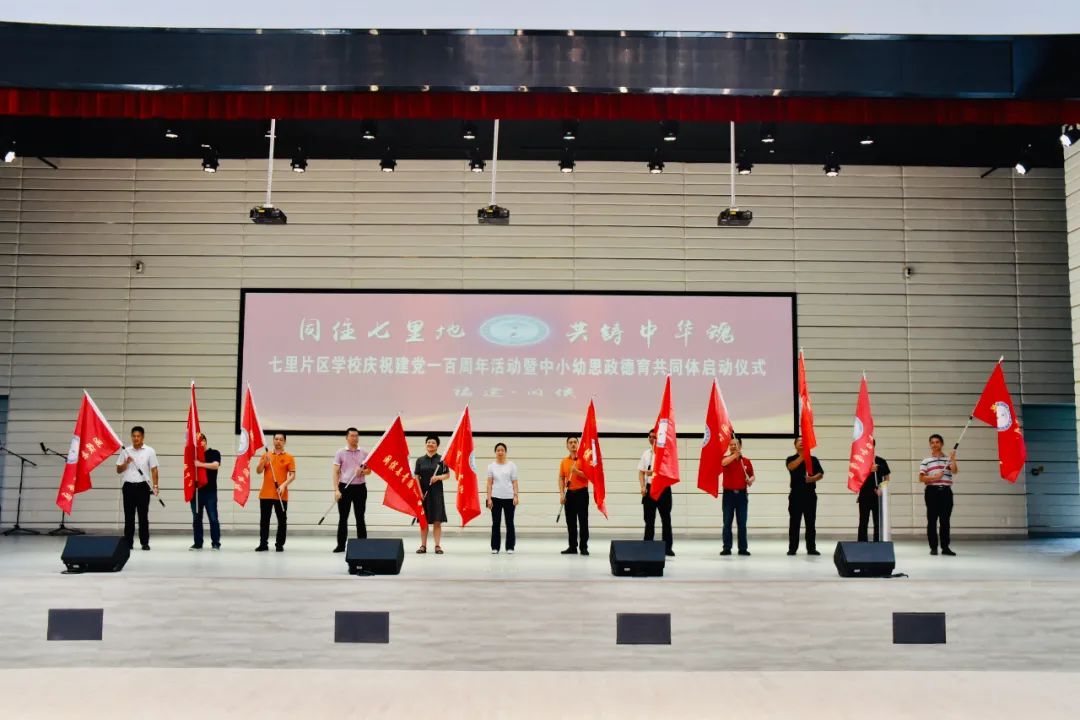 当天上午,闽侯县十一所中小学——闽侯县第二中学、闽侯县东南学校、闽侯县大义中学、闽侯县青圃中学、闽侯县祥谦中学、闽侯县虎峰中学、闽侯县淘江中学、闽侯县尚干中学、青口小学学区、祥谦小学学区、尚干小学学区的师生代表们齐聚闽侯二中,共同举行以“同住七里地,共铸中华魂”为主题的七里片区献礼中国共产党成立100周年暨中小幼思政德育共同体启动仪式。闽侯县教育局,片区内十一所学校校领导及师生代表约700人参加了活动。