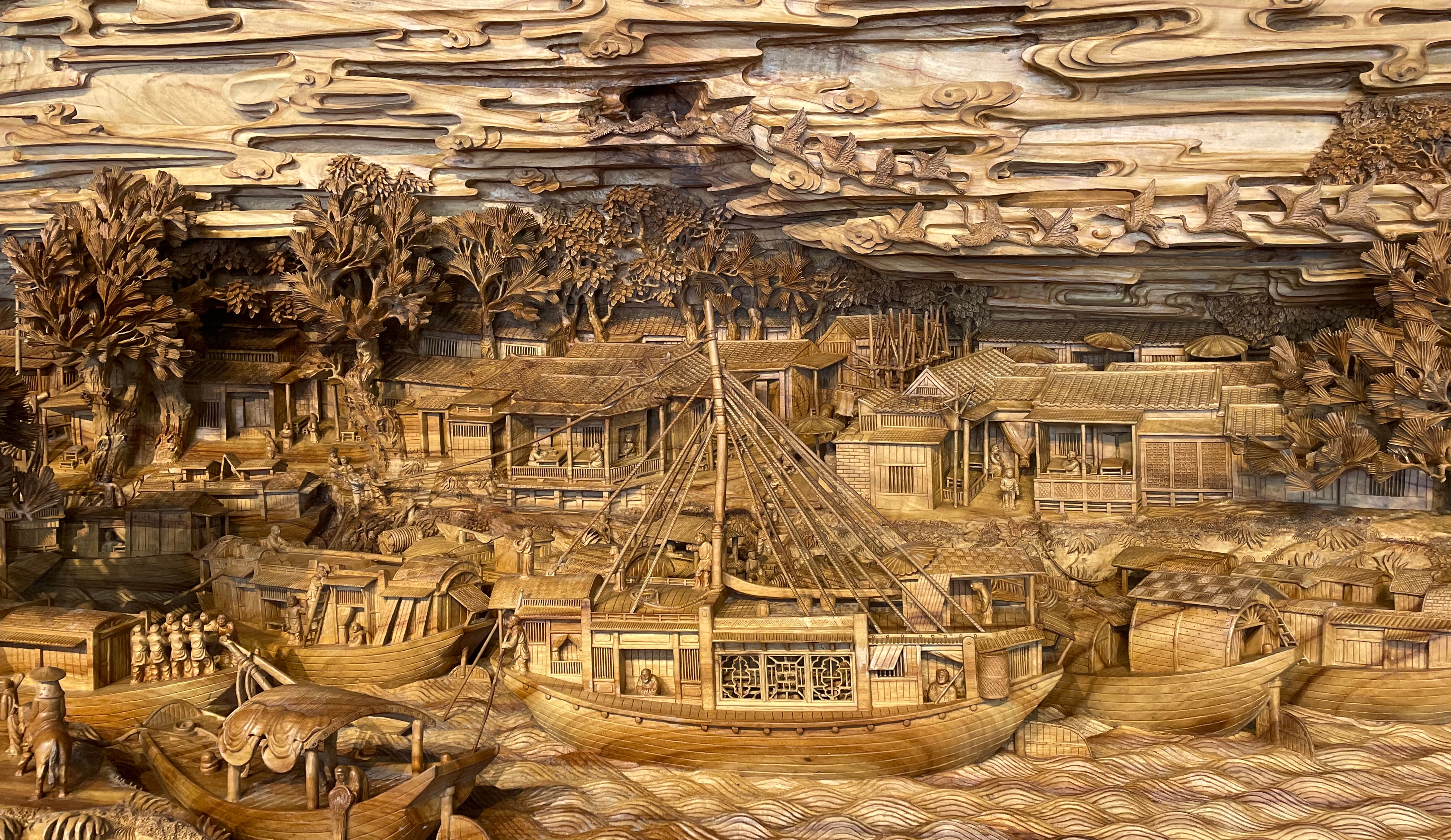 《清明上河图》可谓是郑春辉的“巨作”了,这幅作品前后花了四年的时间,其间,他翻阅了众多文献,请教了专业领域的老师,同时在一面雕出收藏于北京的宋代版《清明上河图》,另一面雕出收藏于中国台北的清代版《清明上河图》。他说,将二者合并在一颗千年樟木山,寄意着两岸的文化交流和精神价值的传承。