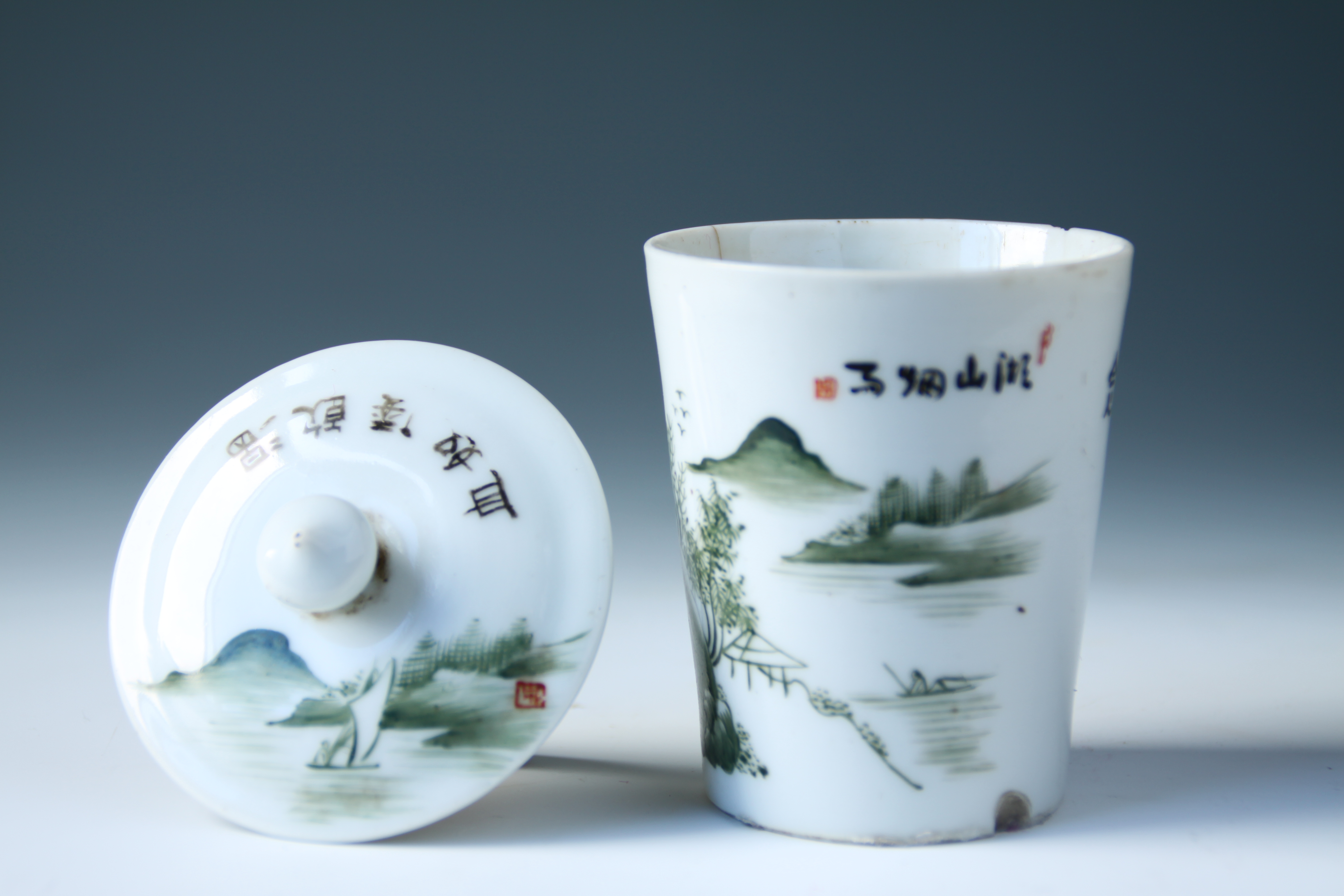 1991年征集,瓷器,口径6.7cm,底径5.1cm,高10.3cm。由盖和杯组成,盖为圆椎钮,平弧顶,沿微折,子母口;杯为小圆唇,敞口,斜直腹,卧足,内墙深斜,足边窄小,露胎,釉平底,胎白细腻,质薄坚致,有强的金属声,釉白中泛青,面光如玻,盖面上绿彩帆船、山溪,并墨书隶体“渴饮倭奴血”,杯外壁墨书“大田抗敌会义卖纪念”、“1939”等字样。质地为瓷,基本保存完整,杯口沿磕损一角,冲口,裂纹。