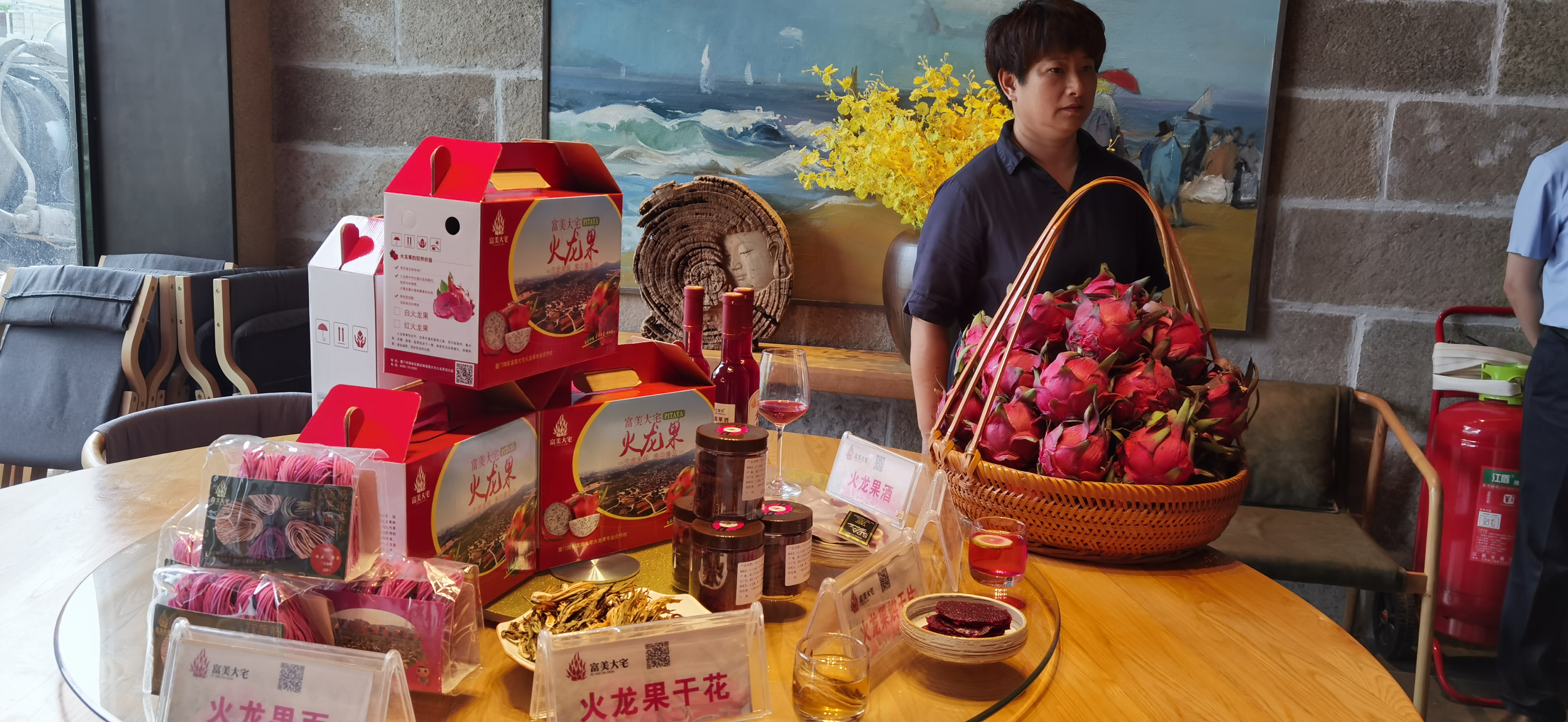 大宅村 “网红姐姐”陈海云也是被乡村振兴吸引,从当地一家大型农业企业辞职回乡创业,现在是富美大宅火龙果专业合作社的负责人。在她带领下,合作社围绕火龙果的延伸产品线已经初具规模,火龙果馒头面条、火龙果肉烘干片、火龙果茶、火龙果酒等自己研发的产品颇受游客青睐。