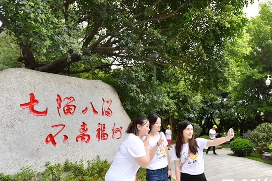 游客在刻着“七溜八溜 不离福州”的石碑前拍照留念。记者 叶义斌 摄