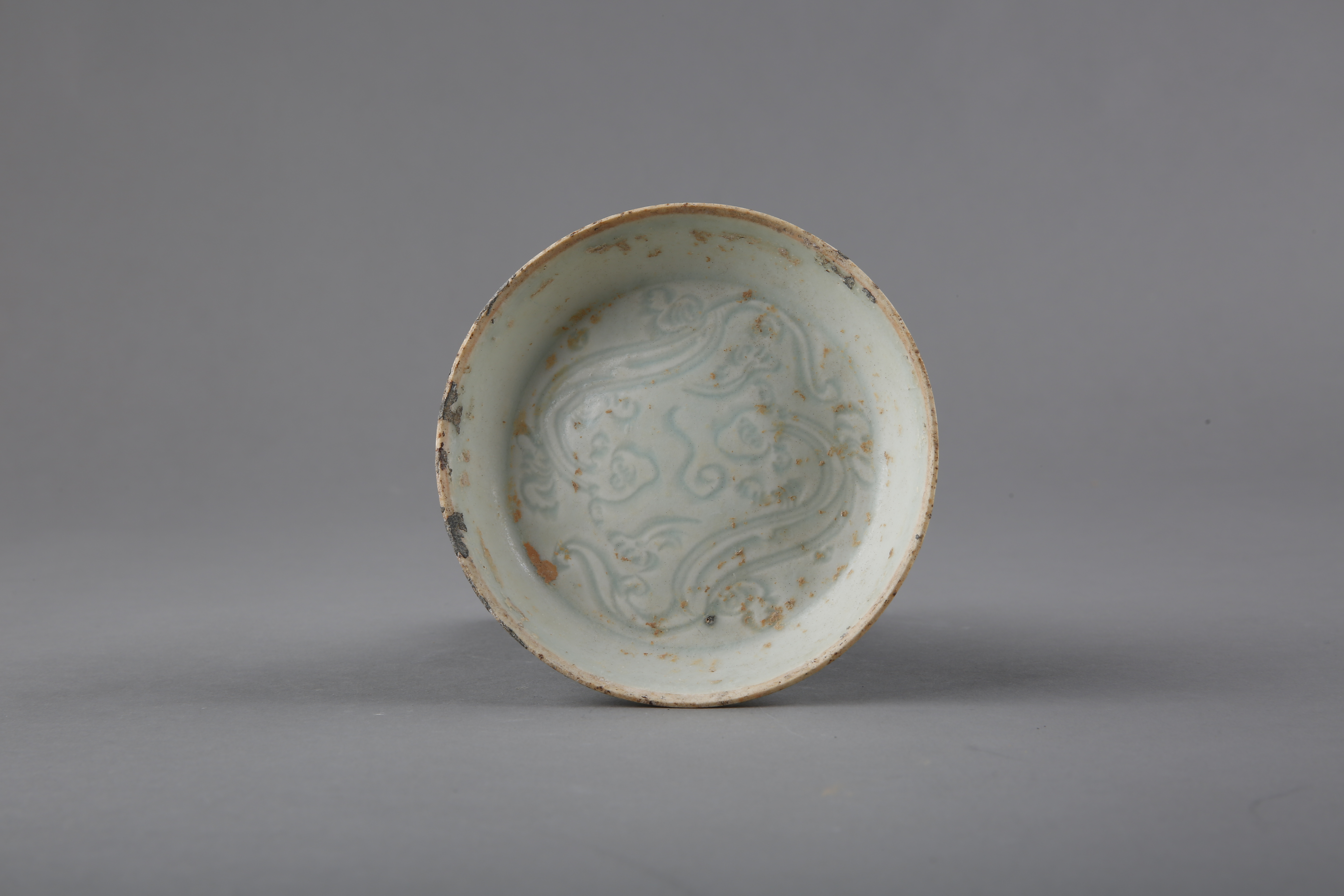 该文物口径11cm,底径8cm,高2cm。从器物特征看为宋代时期湖田窑产品,1999年入藏。芒口外敞,斜腹直壁,平底微内凹。白胎,青白釉,釉面莹润。器口部留有零星银膜,皆已呈腐蚀状态,器内底刻划双螭龙,扑伏相望,极具动感。