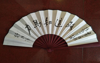 折扇扇面为纸质,扇骨为竹质,扇子半径23.2厘米,弧长49厘米,重26.7克。根据文物故事复制折扇,正面为舒同亲笔写的“路遥知马力”。背面则为中央苏区(闽西)历史博物馆主建筑展厅大楼图。