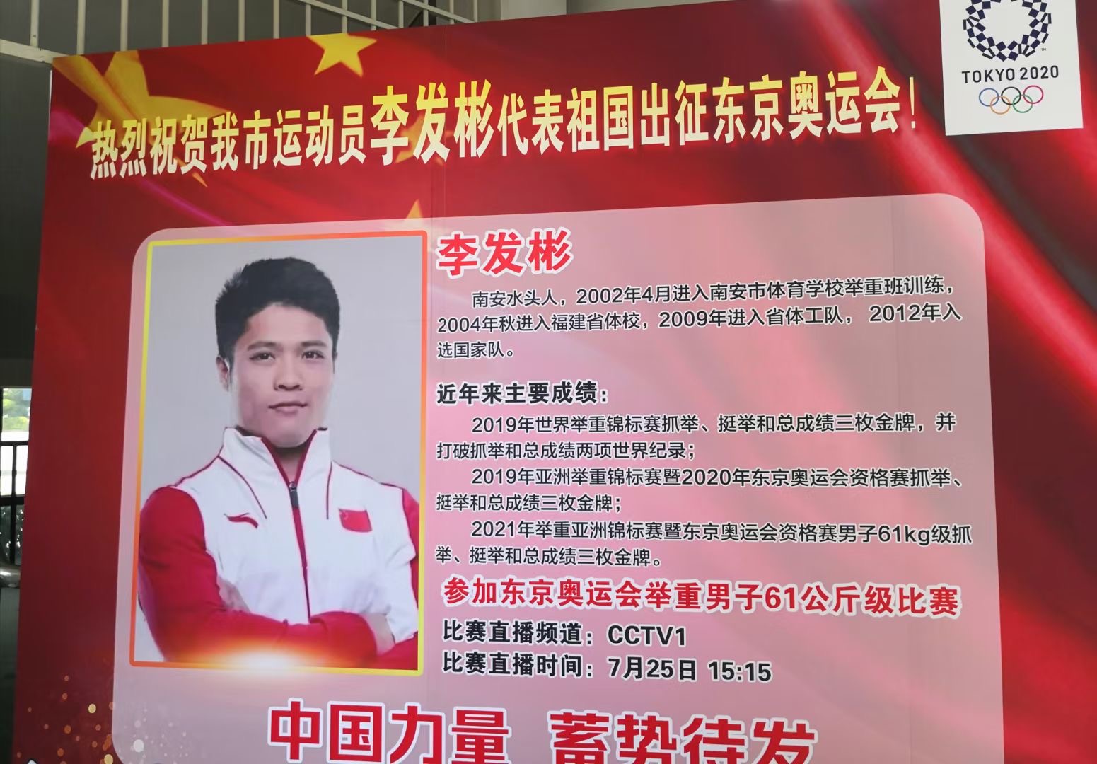 从22日起,南安市体育学校就拉起了“南安人民预祝李发彬夺奥运金牌!”、“向李发彬校友学习!”、“父老乡亲支持发彬!”的横幅。